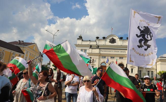 Демонстрантите развяват партийни флагове на „ Възраждане “ и българския байрак .