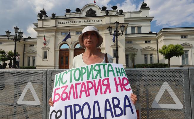 Събралите се скандират „ Оставка “. Издигнат е афиш с надпис: "Историята на България не се продава ". Към протестиращите се причислиха и депутати от партията.