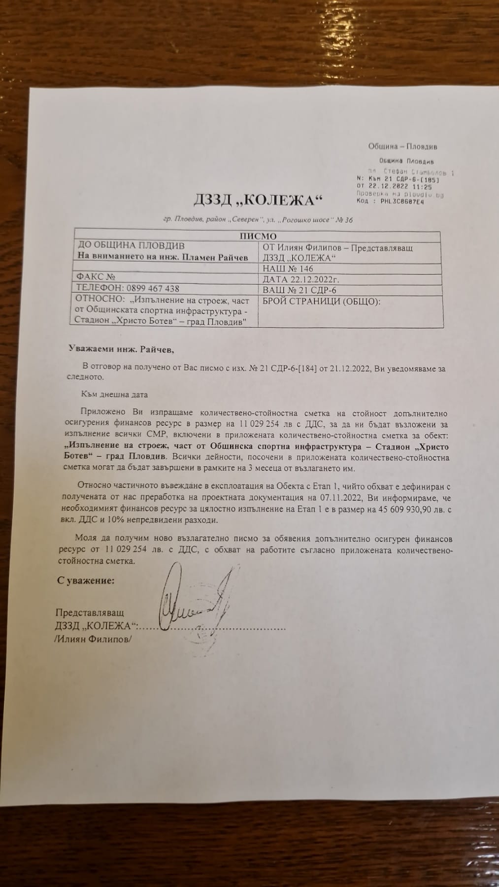На 16-ти декември 2022 година в телефонен диалог Пламен Райчев в наличието на Здравко Димитров даде обещание даването на разбора на количествено-стойностните сметки, предоставени от компанията реализатор на база предадената цялостна планова документи дни по-рано, като в допълнение пое ангажимент за издаване на възлагателно писмо, в което ясно да е разказано, че сумата, отпусната от Общински съвет на град Пловдив в размер на 12 млн. лв., ще бъде целево изразходвана за изцяло покривно покритие на стадион Христо Ботев. И това със период 23т-ти декември 2022г.