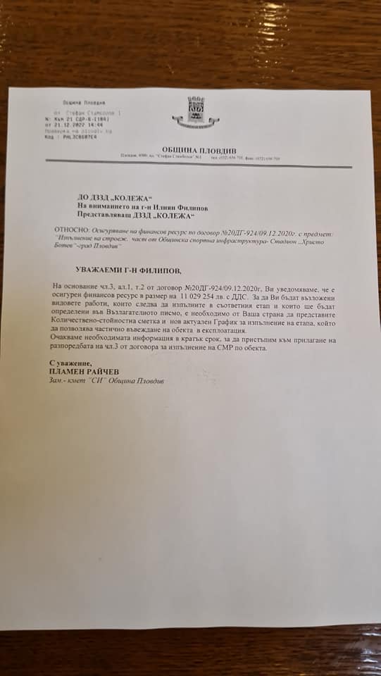 В последните месеци положихме неимоверни старания да бъдем безпределно правилни в връзките си с Вас в нашата най-важна битка, а точно - борбата за Колежа със 100% покривно покритие. След като разбрахме за съществуването на възлагателно писмо от 23.12.2022 година, издадено от община Пловдив за разходване на средствата, гласувани от общински съвет Пловдив за покривно покритие на стадион „ Христо Ботев “, без да е упоменато, че те би трябвало да бъдат вложени в построяването на цялостна покривна структура на стадиона, за финален път удостоверяваме снемането на доверие от вашите персони!
