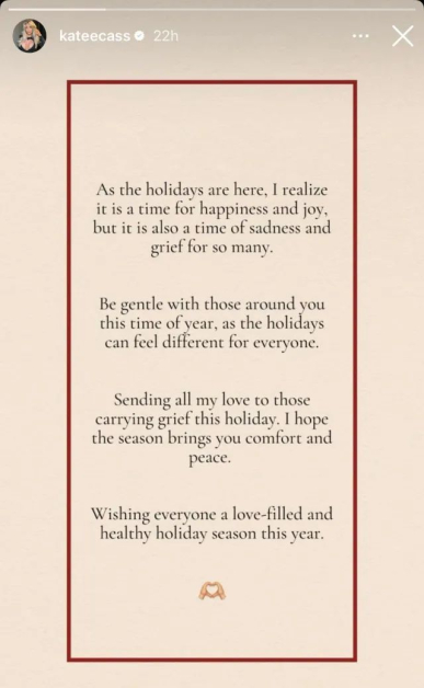 В обява в Инстаграм тя съобщи, че изпраща обич на тези, които „ носят тъга на този празник “, и прикани хората да бъдат нежни към тези, които изпитват тъга по време на Коледа.