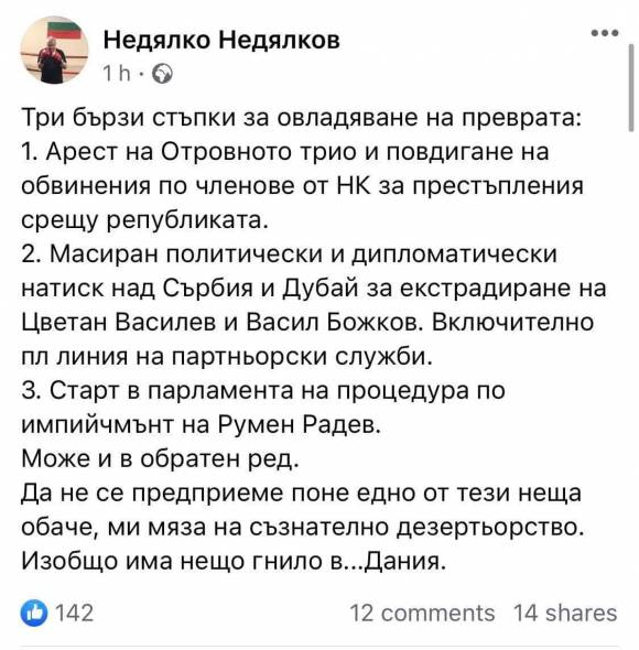 Призив за арест на уредниците на митингите от " Отровното трио " насочи издателят на ПИК Недялко Недялков . Той като позволи неточност в поста си.