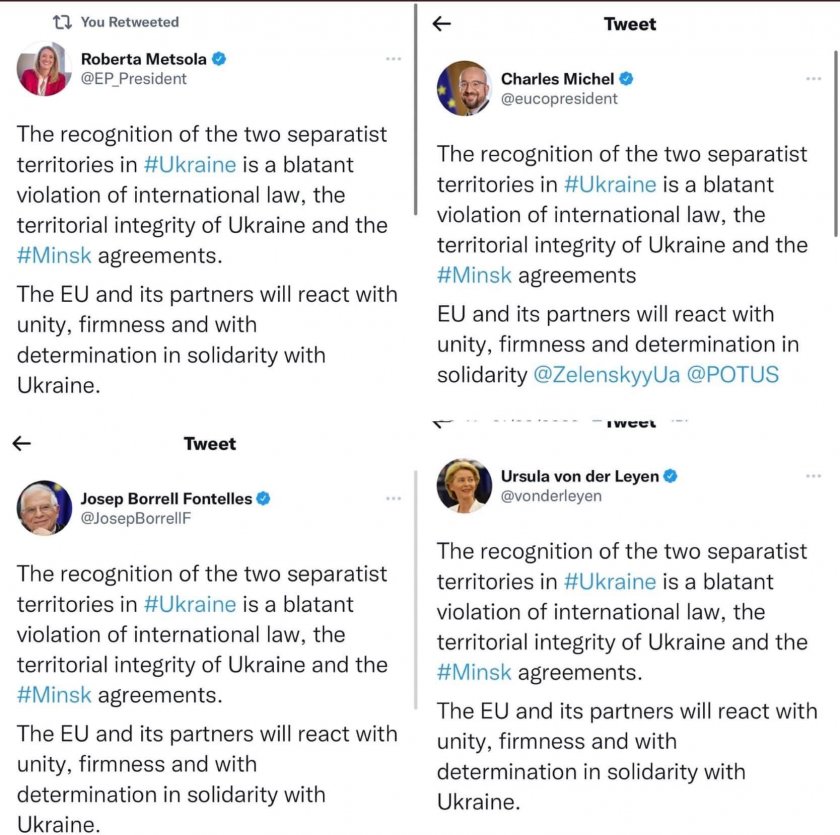 Признававането на двете сепаратистки територии в Украйна за самостоятелни е жестоко нарушение на интернационалното право, териториалната целокупност на Украйна и Минските съглашения. Това написаха в Туитър нощес ръководителите на Европейския парламент Роберта Мецола, Европейската комисия Урсула фон дер Лайен, Европейския съвет Шарл Мишел и посланик номер едно на Европа Жозеп Борел.