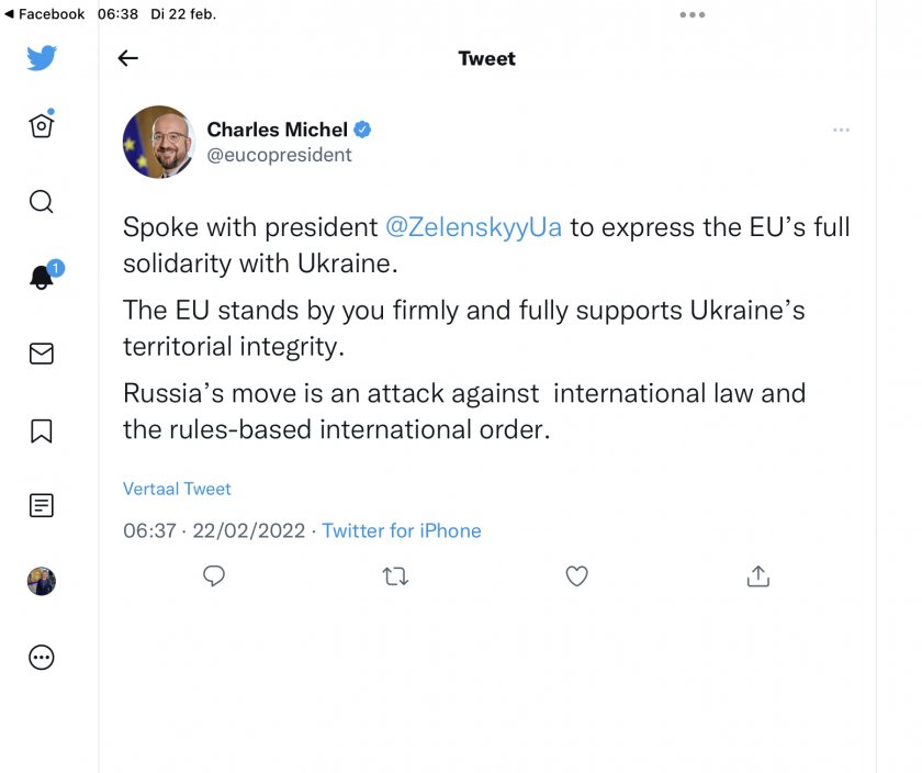 Председателят на Европейски Съюз Шарл Мишел е разговарял с украинския президент Зеленски, за солидарността на Европейски Съюз с Украйна, написа тази заран Мишел в Туитър. По думите му, Европейски Съюз застава твърдо за Украйна и поддържа териториалната целокупност на страната. Ходът на Русия е офанзива против интернационалното право и учредения на правила интернационален ред, споделя още Мишел.