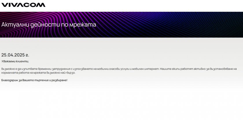 " Уважаеми клиенти, допустимо е да изпитвате краткотрайни усложнения с потреблението на мобилни гласови услуги и мобилен интернет. Нашите екипи работят интензивно за възобновяване на естествената работа на мрежата допустимо най-бързо ".