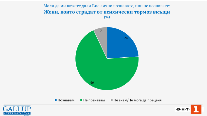 Проечване на " Галъп " по поръчка на Българска национална телевизия демонстрира, че всеки пети у нас познава най-малко една жена, която страда от домашно принуждение. Проучването е извършено сред 1-ви и 9-ти февруари 2024 година измежду 808 души.