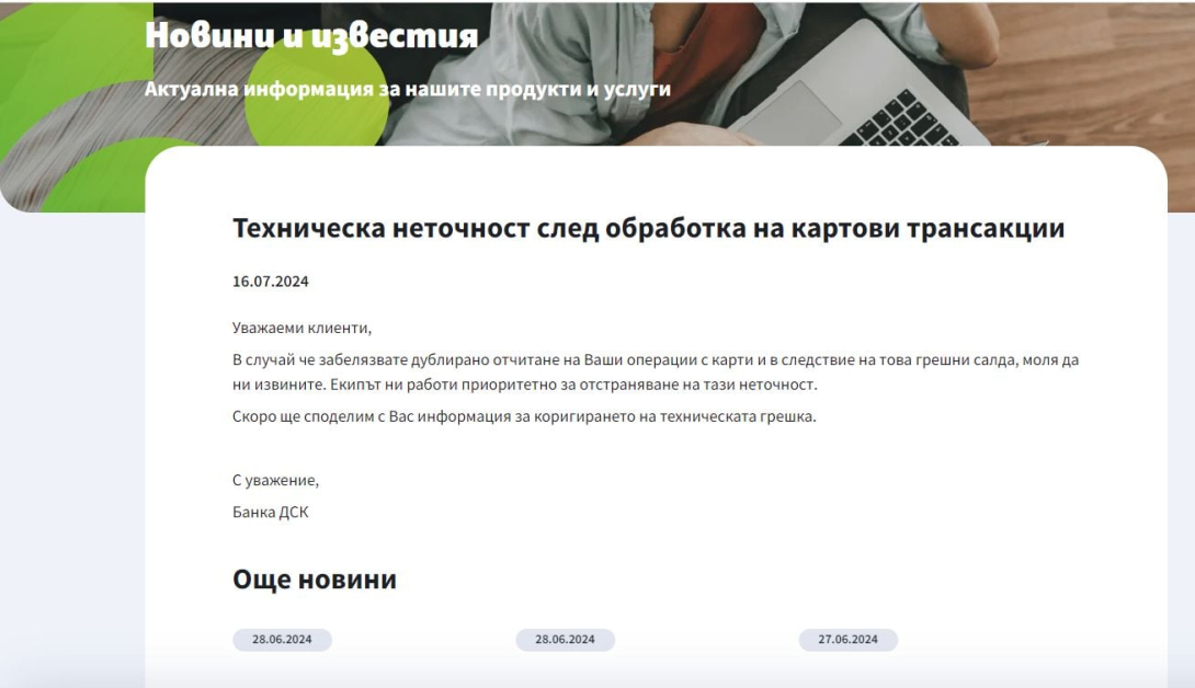 От ДСК оповестиха в уеб страницата си, че има проблем с заплащанията. В известието се показва, че има " техническа неправилност след обработка на картови преводи ". Клиенти оповестяват за повтаряне на транзакции. Тоест в случай че някои от клиентите са създали транзакция от 100 лв., от сметката им са изтеглени общо 200. Банката обявиха, че всички пари ще бъдат възобновени, само че не е явен срокът, в който това ще се случи. В известието се показва, че има " техническа неправилност след обработка на картови преводи ".