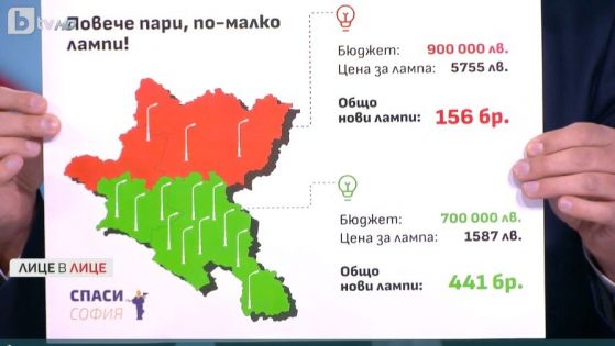 Общинският консултант даде образец и с броя сложени лампи, като съобщи, че едната компания е сложила 156 бр. лампи за 900 000 лева, а другата - 441 бр. за 700 000 лева " Не единствено в Северна София има три пъти по-малко лампи, само че и са дадени 200 000 лева повече ", сподели още той.