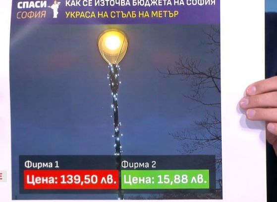 Той даде образец и със светещ кабел, подложен върху дирек, като цената, който той сподели, е за метър на кабел. При едната компания е 139,50 лева, а при другата - 15,88 лева " Всеки дирек ни коства 1400 лева, това са публичните поръчки. Да каже по кое време ще си подаде оставката зам.-кметът на София Кристиан Кръстев ", добави той.