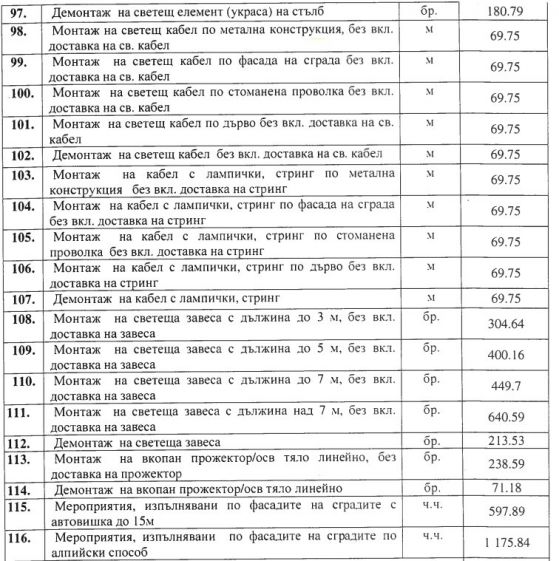 Проблемите не са единствено в публичните поръчки за уличното осветяване в София. В контракт за монтаж и демонтаж на коледната украса например светеща завеса коства 172 лева в регион " Средец ", а пет метра по-назад - 854 лева в " Оборище ".