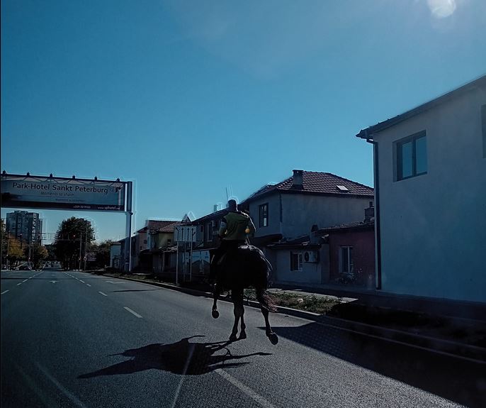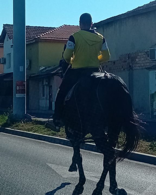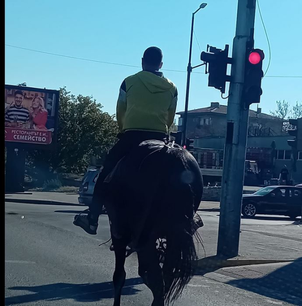 На този декор мъж откри решение на транспортните несгоди. Конник е сниман да препуска самоуверено по оживена пътна в северната част на града. На непредвидената панорама в се натъкнала шофьорка по бул. " Васил Априлов ", преди кръстовището с улица " Дилянка ".