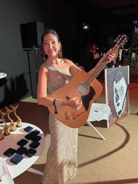 Инструментът е знак на благотворителната вечер в Кан, отдадена на уязвими деца, в която Елена Кристиано взе участие интензивно. Именно там тя наддаде за китарата на Костнър, откакто персонално се срещна с него по време на кинофестивала във Венеция през есента на 2024 година Изпълнението в Пловдив сложи нов живот на инструмента – този път като част от българска културна сцена.