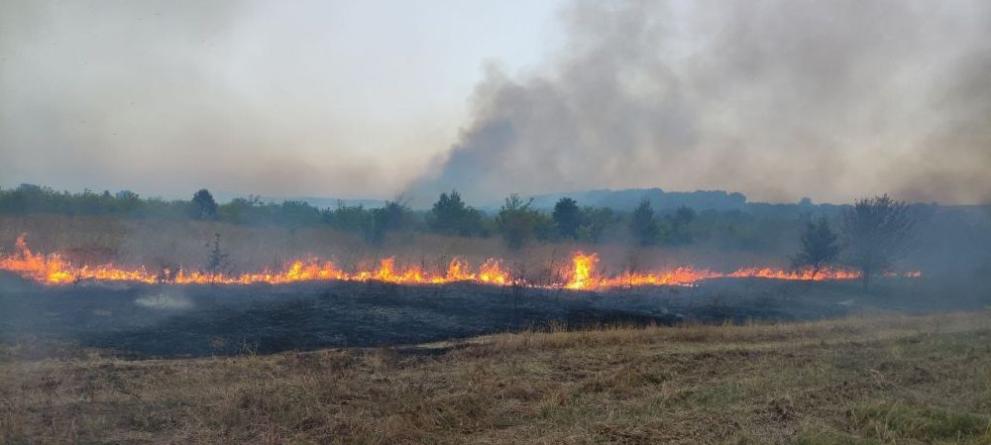Продължават да горят 1300 дка сухи треви и шубраци. На мястото са шест противопожарни автомобила, огнеборци, горски чиновници и доброволци.
