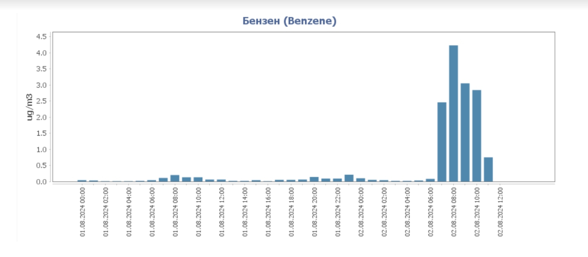 Регистрират се и повишени стойности по индикатор „ бензен “ в АИС „ Тракия “. Те са визуализирани на идната графика. Важно е да се означи, че нормата по индикатора се отнася за осреднени стойности за едногодишен интервал и е 5 µg/m3.
