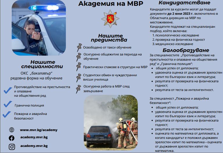 Продължава да тече срокът за банкет в Академията на Министерство на вътрешните работи за образователната 2023/2024. Зрелостниците от междинните учебни заведения и други поданици на Пловдив и района, които желаят да придобият просветително квалификационна степен " бакалавър " в постоянна форма на образование по три специалности, могат да се явят в постройката на регионалната дирекция на ул. „ Княз Богориди ” 7. Приемът на документи се прави всеки работен ден, от 9.00 ч. до 11.00 ч., от чиновници на бранш КАПОЧР в отдел „ Административен ”. До 2 юни в това число претендентите за курсанти подават документи в регионалната дирекция на Министерство на вътрешните работи по местоживеене.