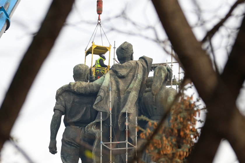 Продължава. Докаран е нов кран, има служащи на място, които режат елементи от композицията. Засилено полицейско наличие и контролно-пропусквателен пункт охраняват монумента в Княжеската градина.