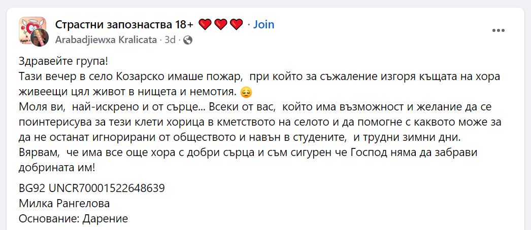 Скрийншот от обява на неистинските данни на сметка: