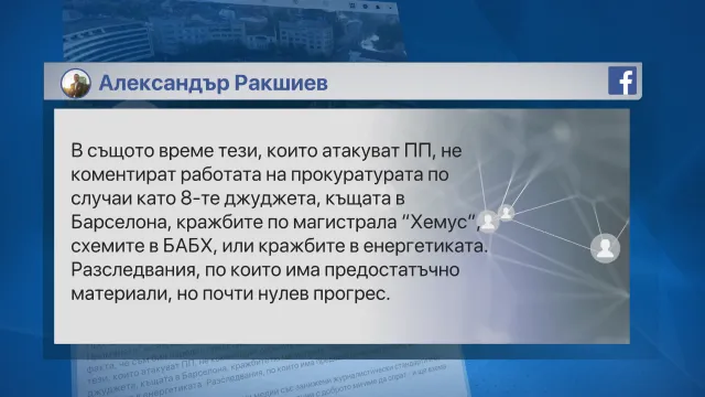 „ В същото време тези, които нападат Политическа партия, не разясняват работата на прокуратурата по случаи като 8-те джуджета, къщата в Барселона, кражбите по автомагистрала „ Хемус “, схемите в БАБХ, или кражбите в енергетиката “, написа той във Facebook.