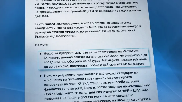 „ Нексо ” не предлага услугите си на територията на Република България, точно тъй като постоянно сме очаквали, че е допустимо да попаднем под обстрела на парадокса. Размерите, в които той може да се разгърне, надминават обаче и най-смелите ни упования “, написа в позицията на „ Нексо “.