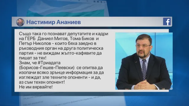 „ Искам да заява, че съм се съветвал с юрист. Ще подхваща съответни правосъдни дейности против всяко едно лице, което оронва моята известност и положително име. Относно Антони Тренчев – били сме дружно народни представители в 43-ото Народно заседание. Познавам го от там, както го познават Тома Биков, Даниел Митов и Петър Николов, които сега са народни представители от ГЕРБ “, сподели Настимир Ананиев от Политическа партия пред bTV.