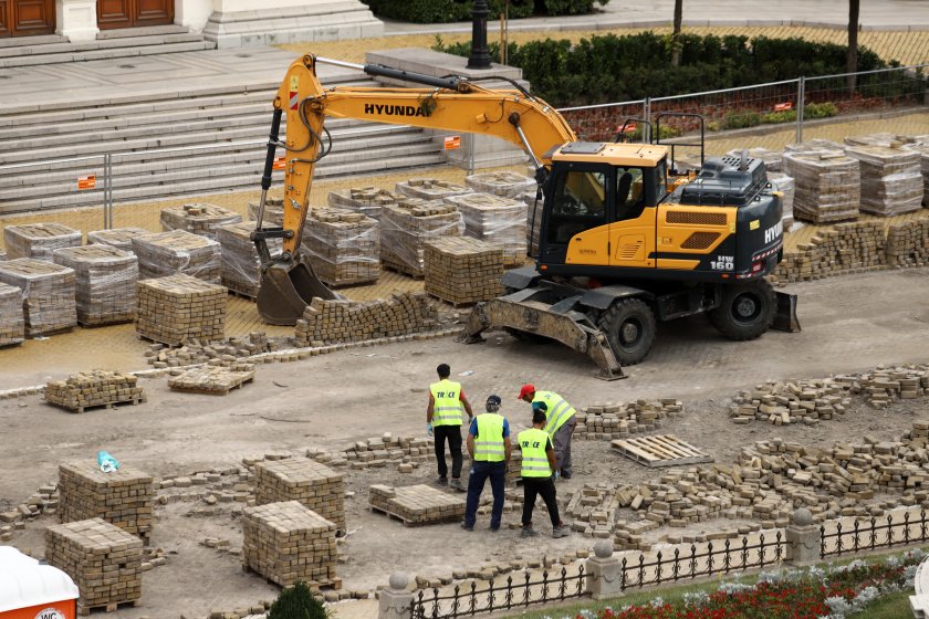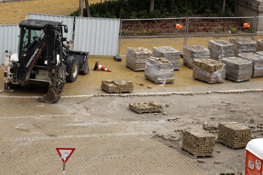 Продължава ремонтът на жълтите павета на площад " Народно заседание ". Мястото към постройката на Народното събрание е затворено за придвижване на коли.