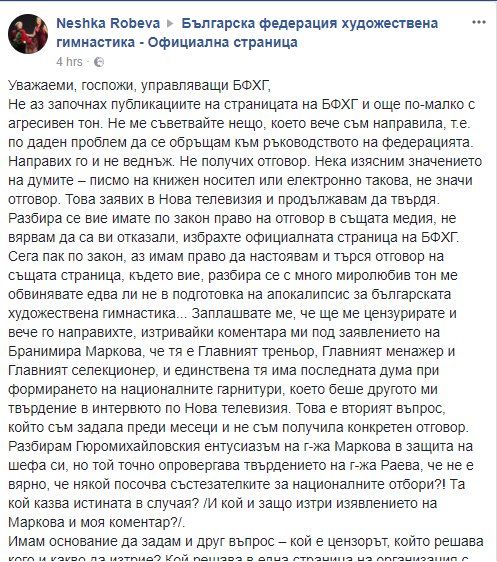 Имам съображение да задам и различен въпрос – кой е цензорът, който взема решение кого и какво да изтрие? Кой взема решение в една страница на организация с идеална цел, която се устоя с обществени средства и би трябвало да е открита за всевъзможни отзиви, кое мнение е нападателно и кое не. Или се трият комфортни и неуместни за управлението отзиви и въпроси? Агресивно ли е мнение, което показва удивление, че вместо обещаните, уличаващи Нешка Робева, документи, се разгласяват протоколи от надпревари. И същият този, високоморален цезор, не е ли прочел писмото на управлението, не го ли намира за малко по-остро в сравнение с благоприличието, по този начин мощно прокламирано от БФХГ, разрешава?