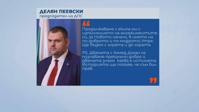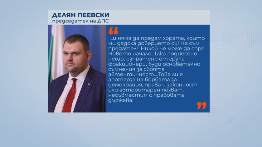 Изключените 17 депутати, на процедура, са се самоизключили като са създали секта ДПС-17. Няма място за по-силен и по-слаб. Това, което се случва, не е в интерес на хората. Едно ще кажа - ново начало! Ще разберете скоро ", сподели Делян Пеевски.