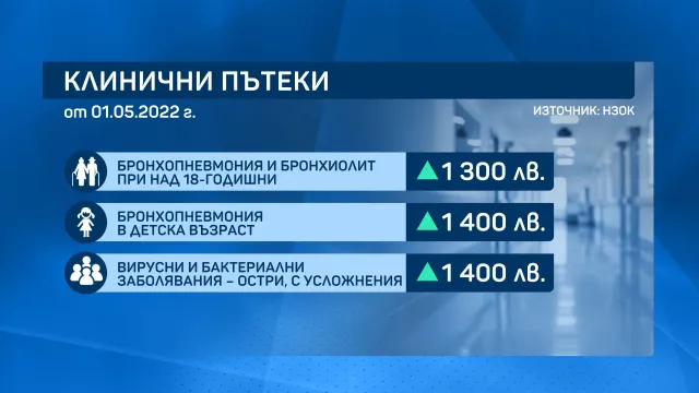 За белодробни заболявания от началото на годината средствата са увеличени, само че все по този начин са незадоволителни. Например за бронхопневмония при възрастни страната заплаща на лечебните заведения 1300 лв. - с 500 повече. При деца нарастването е с 400 лева, а за вирусни и бактериални болести - с 200 лв..