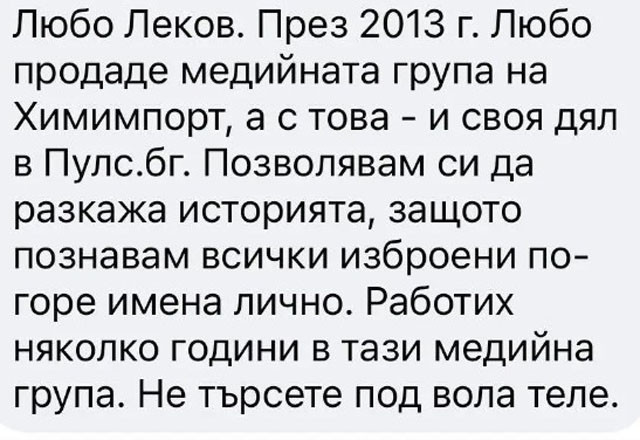 Позволявам си да опиша историята, тъй като познавам всички изброени нагоре имена персонално. Работих няколко години в тази медийна група. Не търсете под вола теле ”. Така общинският консултант от София Димитър Вучев отговори на изявленията на Bird.bg, в която се твърди, че номинираният от ГЕРБ за министър председател проф. Николай Габровски е бил съучастник във компания дружно с сдружение, в собствеността на което се наблюдават акционери свързани с ТИМ.