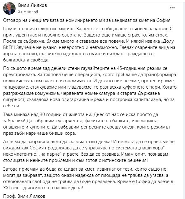 Проф. Вили Лилков съобщи във Facebook, че приема да бъде кандидат-кмет на София, след като политици и интелектуалци започнаха подписка за издигане на кандидатурата му.