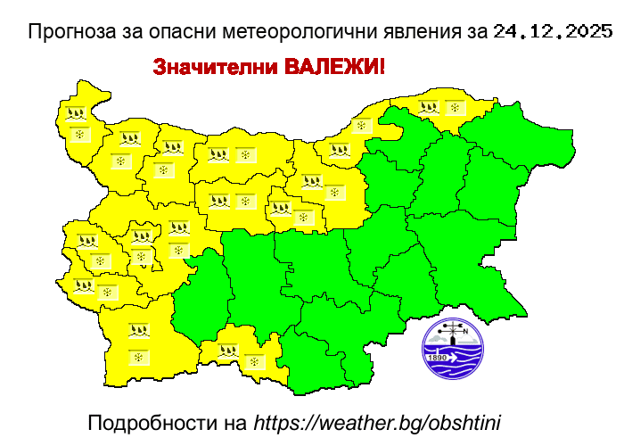 Прогнозата за времето през празничните дни сочи към обилни превалявания от дъжд на Бъдни вечер, 24 декември, които ще преминат в сняг. Очаква се значителни превалявания от 20-35 mm за 24 часа, като в някои региони ще паднат до 30 mm за 6 часа. Също по този начин се плануват условия за формиране на снежна завивка до 10 см и заплаха от замръзване на пътните настилки. За 18 области в страната е разгласен жълт сигнален код.