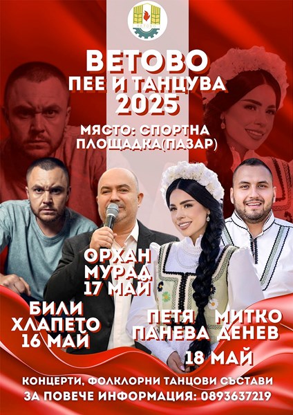 Община Ветово провежда следващото издание на фестивала " Ветово пее и танцува ", който ще се организира от 16 до 18 май 2025 година на Спортната площадка (Пазара) в град Ветово. Празничната стратегия стартира в петък вечер с концерт на известния реализатор Били Хлапето, оповестиха от общинската администрация посредством формалната си страница във Facebook.