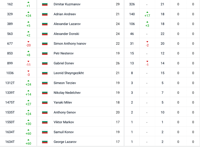 Димитър Кузманов още веднъж записа персонален връх със 162-ото си място (+1) и актив от 326 точки, а третата ни ракета Адриан Андреев прескочи 24 места и от през днешния ден е под №329 със 140 точки, доближавайки се до върховото си класиране, което 319-о място от 13 септември 2021 година.