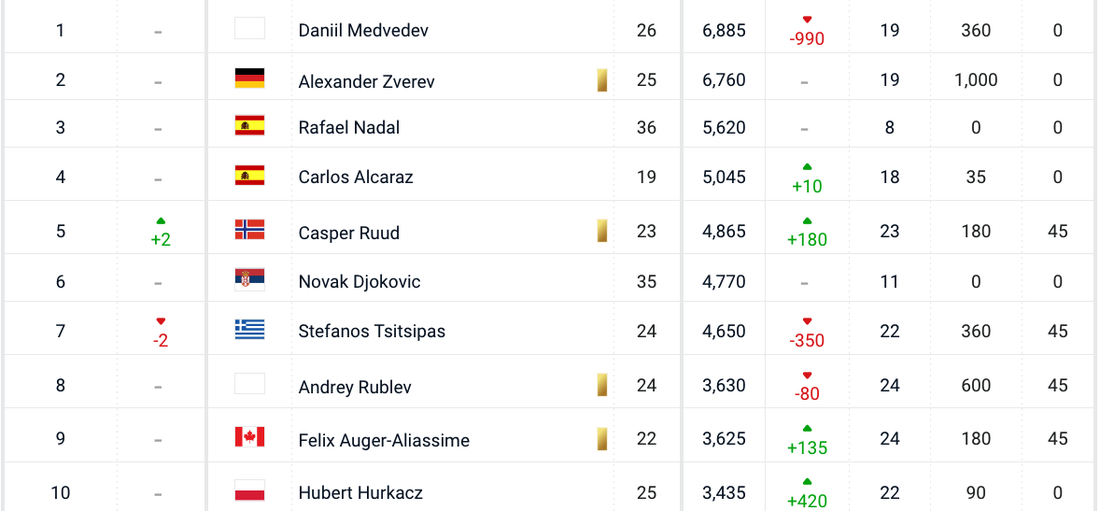 В челото на международната класация също има разбърквания. №1 остава Даниил Медведев с 6885 точки, следван от Александър Зверев с 6760, Рафаел Надал с 5620 и Карлос Алкарас с 5045, само че пети към този момент е Каспер Рууд, който прогресира с две места и повтаря най-хубавото си класиране досега. Шести е Новак Джокович, а Стефанос Циципас се смъкна от 5-а на 7-а позиция. Осми е Андрей Рубльов, следван от Феликс Оже-Алиасим и Хуберт Хуркач.