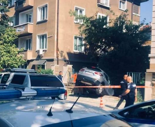 На местопроизшествието са пристигнали служители на реда. Машината е с отворени въздушни възглавници, част от нея е в двора, а другата е във въздуха.