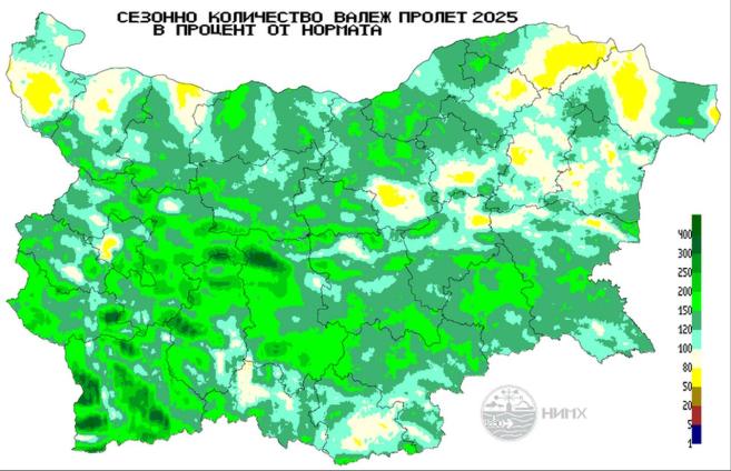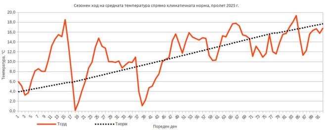 Тя е със междинни сезонни температури към и над нормата, с отклоняване сред минус 0,5 и плюс 1,5 градуса. По отношение на преваляванията е сходна на пролетта на 2024 и 2023 година Сезонните суми на преваляванията имат отклоняване от нормата сред 53 и 155%.