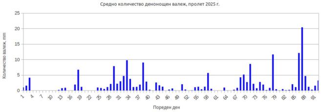 Месец март е с превалявания към нормата и е сходен на месеците март на последните две години – 2023 и 2024. Месец април също е с превалявания към нормата в необятни граници. Той е с по-малко превалявания от месеците април от 2021 година насам. Месец май е с превалявания към или над нормата и е най-валежният месец май от 2017 година насам. Най-голямото измерено 24-часово количество дъжд е 108,5 мм (л/кв.м) в с. Лехчево, обл. Монтана, на 27 април.