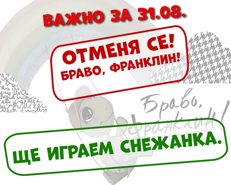 Промяна и на 31 август Втората смяна визира последното зрелище от месеца - на 31 август от 11:00 часа вместо " Браво, Франклин " ще се играе " Снежанка ". Авторският театър на Мая и Митко Димитрови по приказката на Братя Грим направи премиера в театъра през февруари тази година.