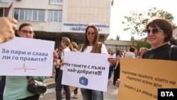 Част от протестиращите носеха плакати с надписи " Аз имам вяра на лекарите в " Майчин дом ", " Не гонете положителните лекари с неистини ", " За пари и популярност ли го вършиме " и други.