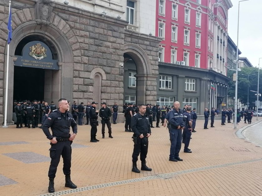 Три кордона полиция има пред постройката на Министерския съвет. Освен униформени служители на реда и жандармерия, митингът се охранява и от тежко снаряжени елементи с щитове и каски под колоните на държавната постройка.