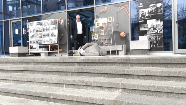 Протест пред съветския културен център в София – мъж легна със завързани ръце на входа на постройката. По-късно беше помолен от полицията да напусне територията на центъра.