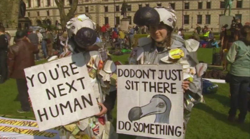 Хиляди природозащитници излязоха на един от най-шумните и цветни митинги, в постоянно разгласявания от демонстрации Лондон. Дървета с надпис " дните ни са преброени " блокираха моста Ватерло. Централата на петролната компания " Шел " е с изпотрошенени прозорци, а по фасадата със спрей протестиращите написаха " убийци ".
