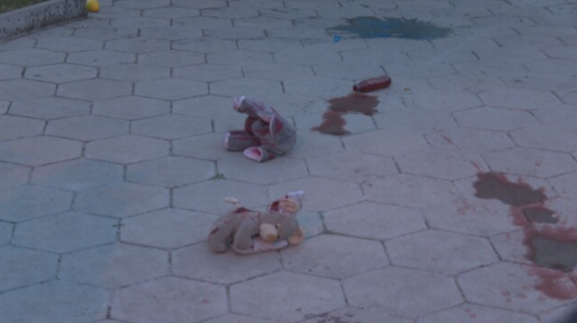 Протестиращи хвърляха против легация и плюшени играчки, очапани с кръв като символика на починалите в Украйна деца.