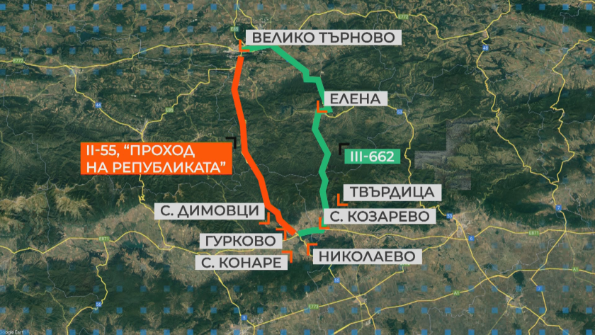 За пътуващите през Прохода на Републиката - от Велико Търново по общински път за с. Димовци към гр. Николаево, като се включват при пътния възел при Гурково на път I-6 София - Бургас /Подбалканския път/, от Гурково към Велико Търново по път II-55 към Прохода на Републиката се пренасочват на бензиностанция " Петрол " по път III-5007 с. Конаре, с. Козарево, гр. Твърдица и се включват по път III-662 Твърдица - Елена към гр. Велико Търново.