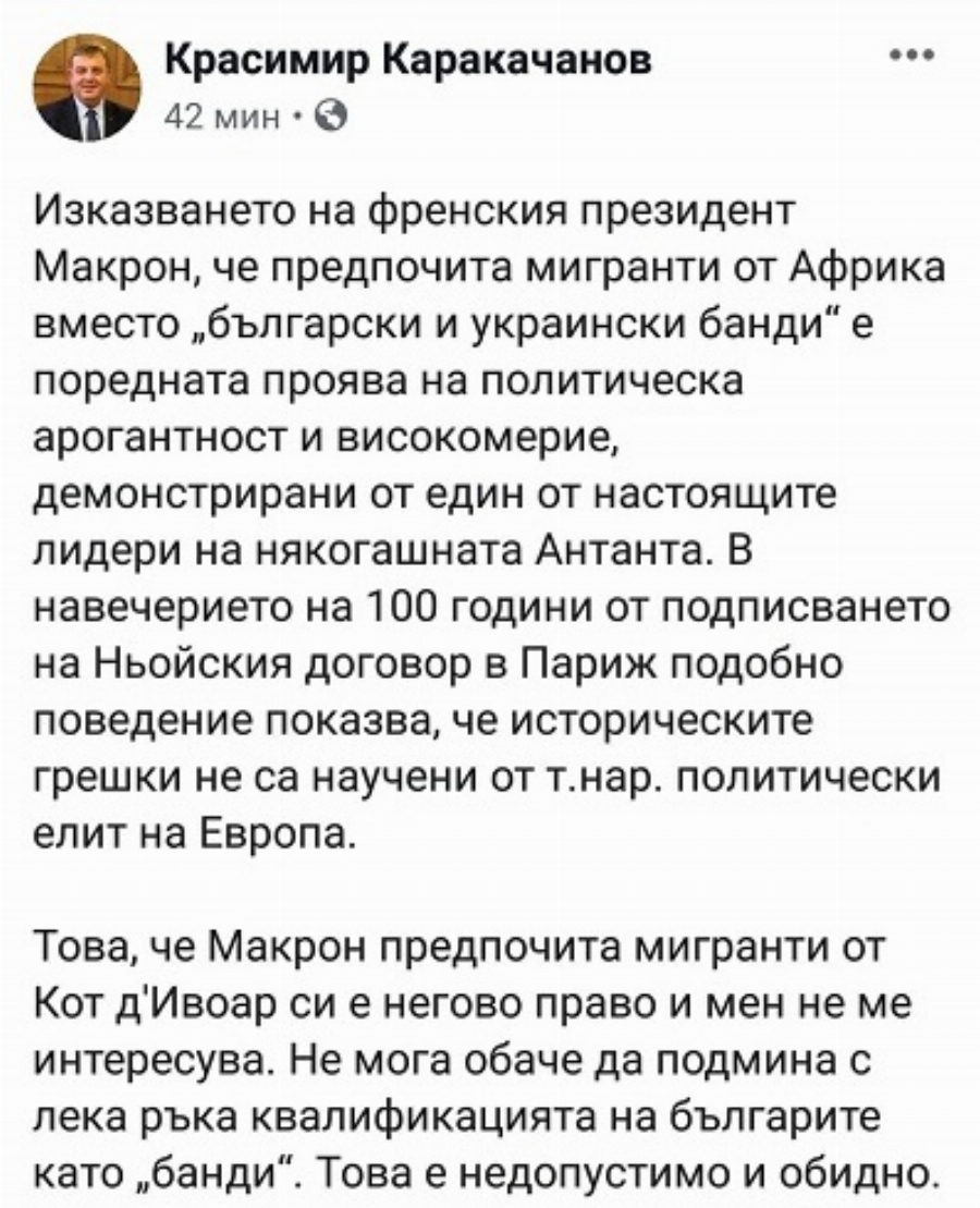 " Изказването на френския президент Макрон, че избира мигранти от Африка вместо „ български и украински банди “ е следващата демонстрация на политическа надменност и надменност, демонстрирани от един от актуалните водачи на тогавашната Антанта. В навечерието на 100 години от подписването на Ньойския контракт в Париж сходно държание демонстрира, че историческите неточности не са научени от по този начин наречения политически хайлайф на Европа. Това, че Макрон избира мигранти от Кот д`Ивоар си е негово право и мен не ме интересува. Не мога обаче да подмина с лека ръка квалификацията на българите като „ банди “. Това е неприемливо и обидно.