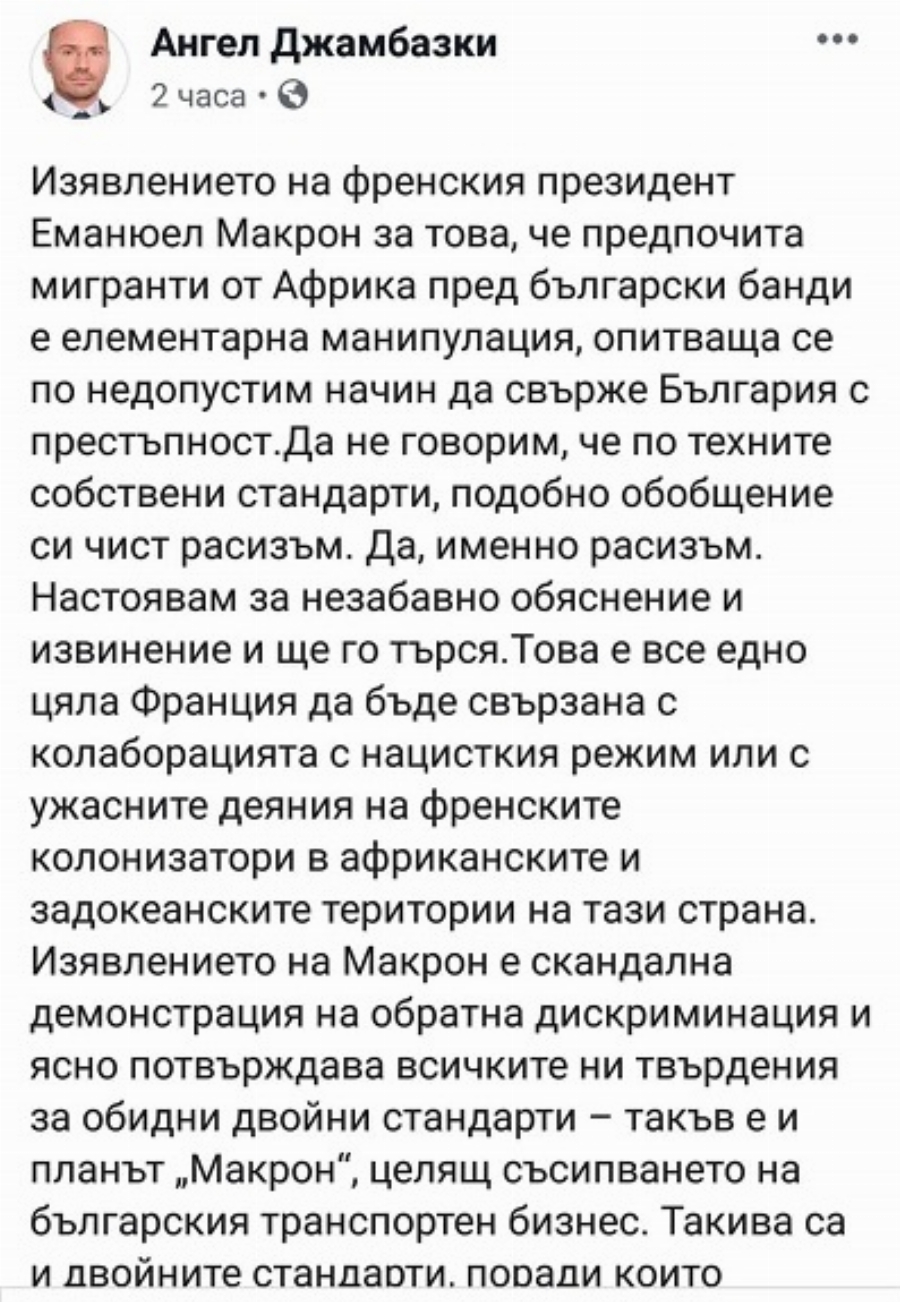 " Изявлението на френския президент Еманюел Макрон за това, че избира мигранти от Африка пред " български банди ", е обикновена операция, опитваща се по неприемлив метод да свърже България с престъпност. Да не приказваме, че по техните лични стандарти сходно резюме си е чист расизъм. Да, точно расизъм. Настоявам за неотложно пояснение и опрощение и ще го диря. Това е все едно цяла Франция да бъде обвързвана с колаборацията с нацисткия режим или с ужасните действия на френските колонизатори в африканските и задокеанските територии на тази страна. Изявлението на Макрон е скандална проява на противоположна дискриминация и ясно удостоверява всичките ни изказвания за обидни двойни стандарти – подобен е и проектът „ Макрон “, целящ съсипването на българския транспортен бизнес.