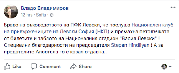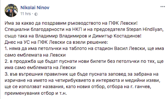 “Браво на управлението на ПФК Левски, че послуша Национален клуб на последователите на Левски София (НКП) и отстрани петолъчката от билетите и таблото на Националния стадион “Васил Левски”! Специални благодарности на ръководителя Степан Хиндлиян! А за предателите Апостола го е споделил отдавна…”, написа някогашният началник на фенклуба Владимир Владимиров - Гугутката.