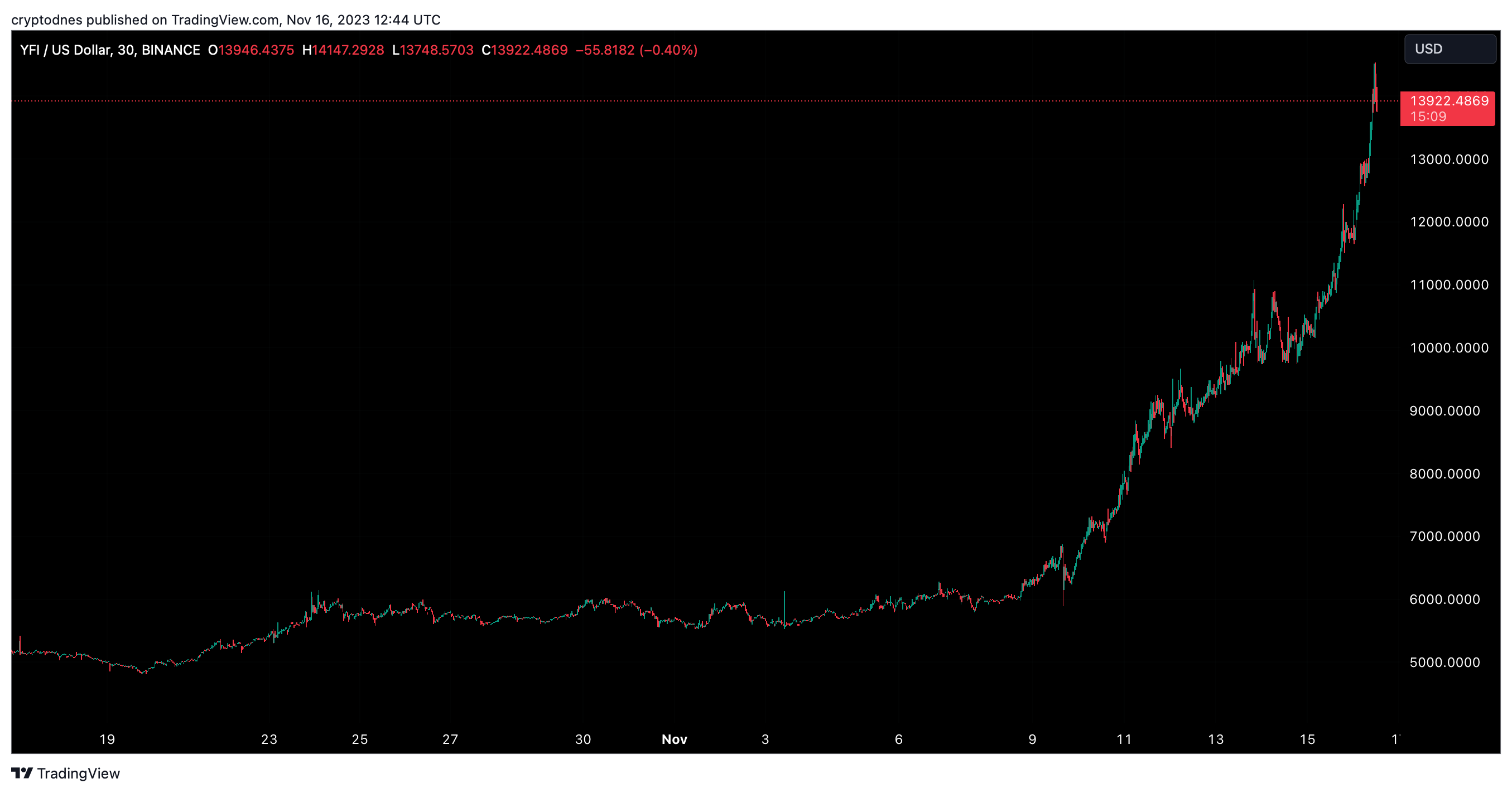 Цената на YFI , родния токен на Yearn.Finance, платформа за автоматизиран “ “, все още на писане на публикацията възлиза на $13,920, което отразява към 110% растеж за последните 7 дни.