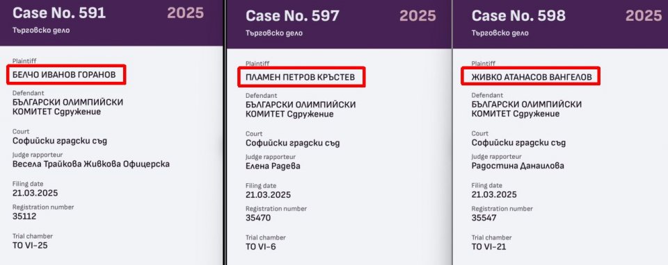 При това жалбата на генералния секретар е импортирана първа по време. Малко по-късно, отново на 21 март, в Софийски градски съд на 21 март са постъпили още две обжалвания. Едното е от трикратния балкански първенец в бягането на 110 м с препятсвия Пламен Кръстев, който е самостоятелен член на БОК и бе издигнал официално кандидатурата на Стефка Костадинова, а другото от олимпийския вицешампион по битка от Сеул`88 и повторен международен отличник Живко Вангелов - също самостоятелен член.