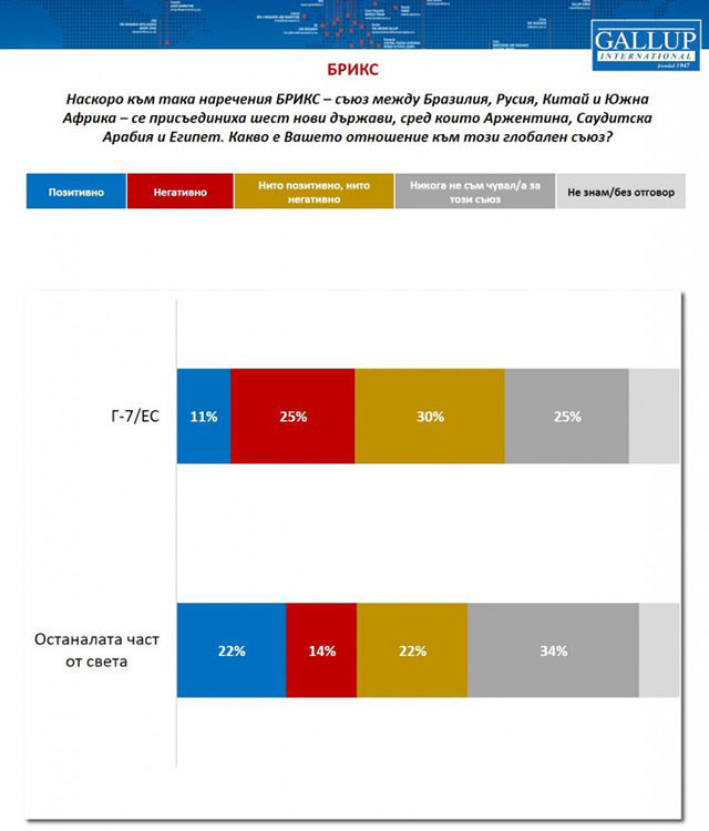 И в България осведомеността за БРИКС и неговото разширение е по-скоро ниска. България попада измежду страните, в които най-високият дял отговори е " в никакъв случай не съм чувал/а за това " - 38%. Сред тези, които заявяват, че са осведомени и имат мнение, отрицателните и позитивните оценки са равни - по към една десета (11%). Нито положителни, нито отрицателни настройки към БРИКС имат към една четвърт от запитаните у нас, а други 14 на 100 не съумяват да формулират мнение.